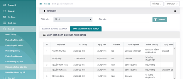 - Bước 1: Đăng nhập >> Vào menu “Cán bộ” >> Vào Chức năng “Đánh giá xếp loại giáo viên” >> Chọn tab “ Đánh giá chuẩn nghề nghiệp”