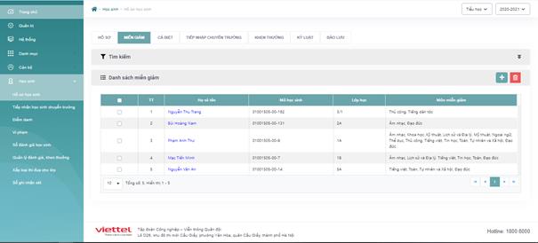 - Bước 2: Hiển thị màn hình Miễn giảm học sinh