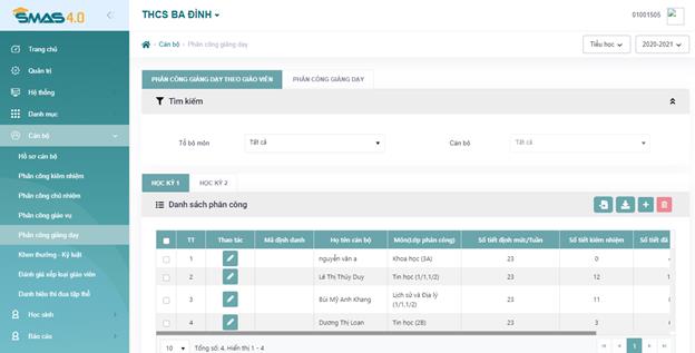 - Bước 1: Đăng nhập >> Vào menu “Cán bộ” >> Vào Chức năng “Phân công giảng dạy” >> Chọn tab “Phân công giảng dạy theo giáo viên”