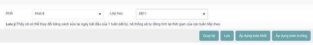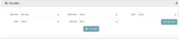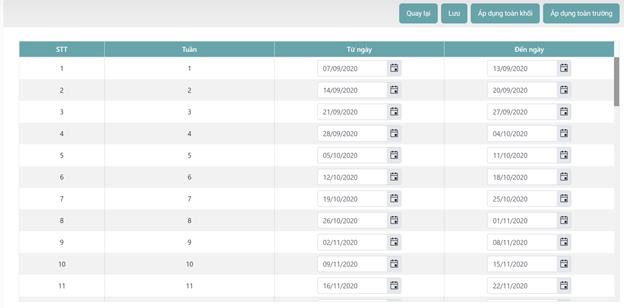 Bước 3.3: Hệ thống sẽ tự động hiển thị bảng kết quả theo các tiêu chí tìm kiếm, trong bảng kết quả tìm kiếm, NSD có thể cấu hình lại tuần bằng cách chọn ngày bắt đầu của 1 tuần bất kỳ tại cột <Từ ngày>, hệ thống sẽ tự động tính lại thời gian các tuần tiếp theo.