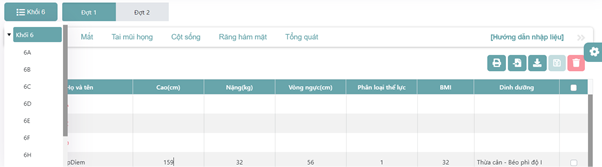 => Hệ thống hiển thị thông tin khám sức khoẻ theo điều kiện tìm kiếm theo khối, lớp, đợt khám. Mặc định hiển thị thông tin tab Thể lực
