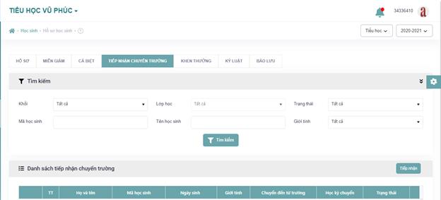 - Bước 1: Đăng nhập >> Chọn Menu “Học sinh” >> Chọn chức năng “Hồ sơ học sinh”>> Click Tab Tiếp nhận chuyển trường. Hiển thị màn hình Tiếp nhận chuyển trường