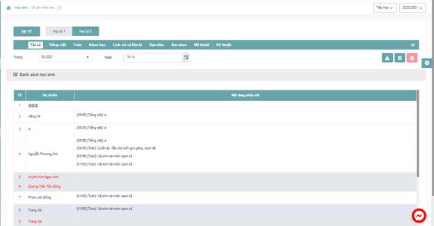 - Bước 2: Chọn Môn học->Chọn Lớp học tương ứng với môn giáo viên được phân công giảng dạy-> Chọn Học kỳ -> Chọn Tháng (Load danh sách các tháng theo học kì đã chọn)->Chọn Ngày (Load ra theo tháng để User chọn)-> Hiển thị danh sách tất cả các nhận xét