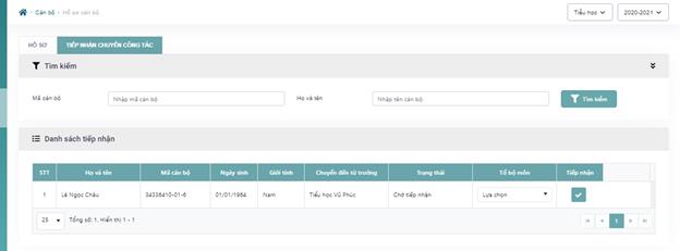 - Bước 1: Đăng nhập >> Vào menu “Cán bộ” >> Vào Chức năng “Hồ sơ cán bộ” >> Chọn Tab “Tiếp nhận chuyển công tác” >> Hiển thị màn hình Tiếp nhận chuyển công tác