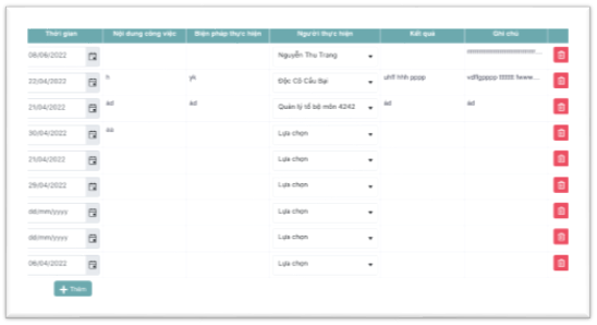 - Bước 5: Nhập thông tin Thời gian, Nội dung công việc, Biện pháp thực hiện, Người thực hiện, Kết quả, Ghi chú