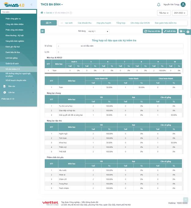 - Bước 1: Đăng nhập >> vào Menu “Cán Bộ’’ >> Vào chức năng “Sổ chủ nhiệm 2.0” >> chọn tab “Tổng hợp”. Hiển thị màn hình sau