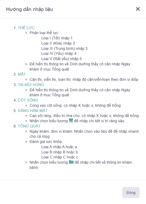 - Bước 1: Tại màn hình “Sổ khám SK hằng năm”, NSD kích chọn => Hệ thống hiển thị màn hình “Hướng dẫn nhập liệu”