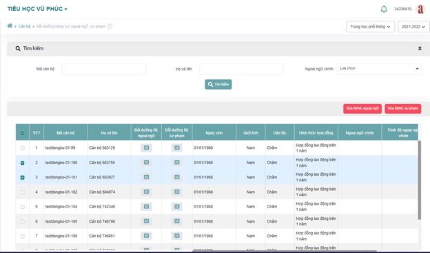 Bước 2: Chọn checkbox bản ghi cán bộ cần xóa BDNL ngoại ngữ