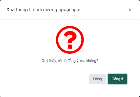 Bước 5: Chọn Đồng ý để Xóa BDNL ngoại ngữ, chọn Đóng để đóng popup quay về popup Quá trình Bồi dưỡng năng lực ngoại ngữ, sư phạm của cán bộ