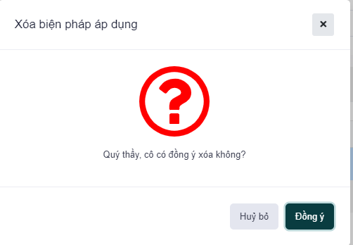 Bước 1: Trên danh sách lưới ‘Theo dõi các biện pháp’ click button ở bản ghi có biện pháp áp dụng cần xóa • Hiển thị pop-up ‘Xóa biện pháp áp dụng’