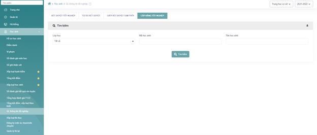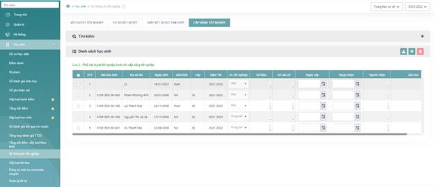 Bước 1: Đăng nhập >> Chọn Menu “Học sinh” >> Chọn chức năng “QL thông tin tốt nghiệp”>> chọn tab “Cấp bằng tốt nghiệp”