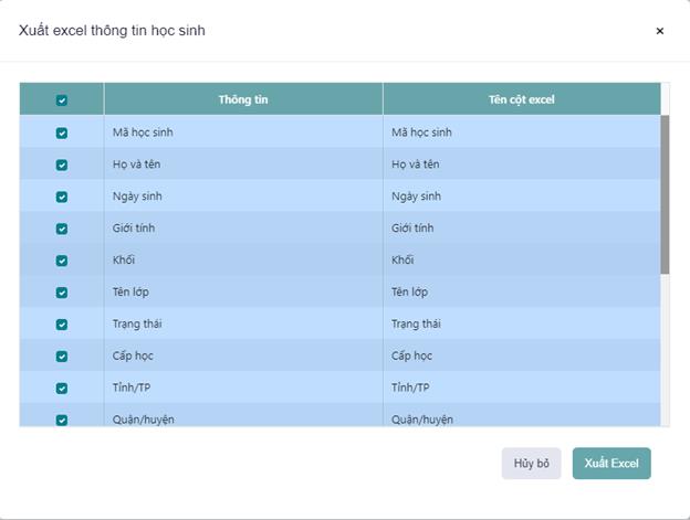 - Bước 3: Tích hoặc bỏ chọn các cột để xuất ra excel