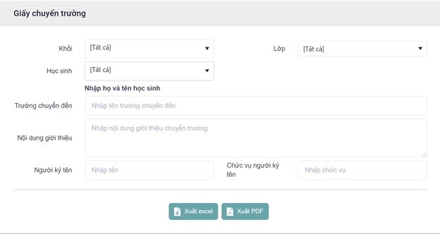 Bước 1: Đăng nhập >> Vào menu “Báo cáo” >> Chọn “Báo cáo hồ sơ học sinh” >>Chọn menu “Giấy chuyển trường”