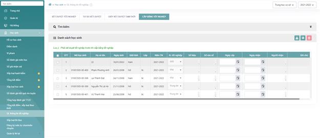 - Bước 1: Đăng nhập >> Chọn Menu “Học sinh” >> Chọn chức năng “QL thông tin tốt nghiệp”>> chọn tab “Cấp bằng tốt nghiệp”
